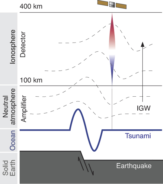 Figure 3. The tsunamigenic earthquake mechanism and transfer of energy in the neutral and ionized atmosphere. The solid Earth displacement produces the tsunami and the sea surface displacement produces an internal gravity wave in the neutral atmosphere, which perturbs the electron distribution in the ionosphere.