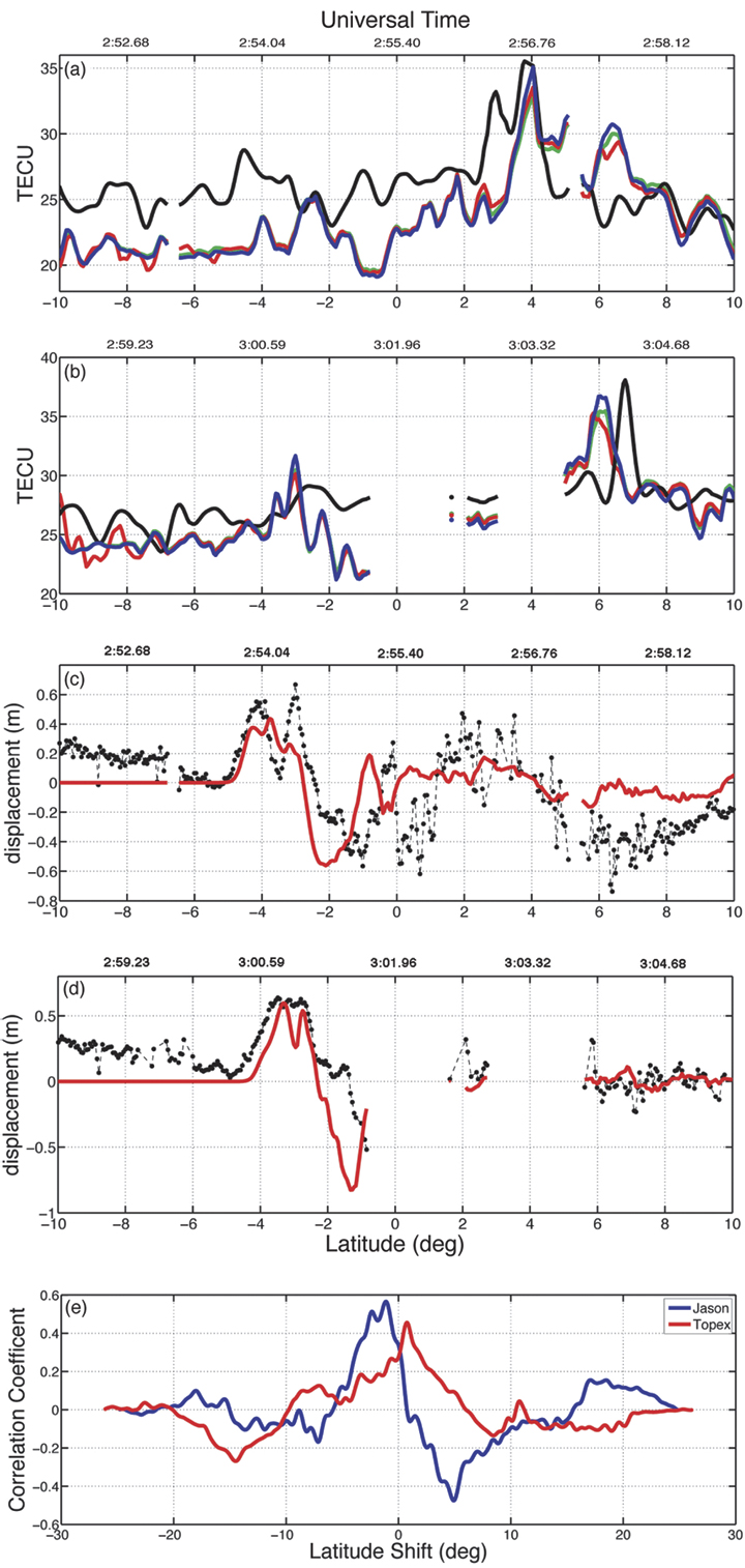 Figure 4. Satellite altimeter and total electron content (TEC) signatures of the Sumatra tsunami. The modeled and observed TEC is shown for (a) Jason-1 and for (b) Topex/Poseidon: data (black), synthetic TEC without production-recombination-diffusion effects (blue), with production-recombination (red), and production-recombination-diffusion (green). The Topex/Poseidon synthetic TEC has been shifted up by 2 TEC units. In (c) and (d), the altimetric measurements of the ocean surface (black) are plotted for the Jason-1 and Topex/Poseidon satellites, respectively. The synthetic ocean displacement, used as the source of internal gravity waves in the neutral atmosphere, is shown in red. In (e), the cross-correlations between TEC synthetics and data are shown for Jason-1 (blue) and Topex/Poseidon (red).