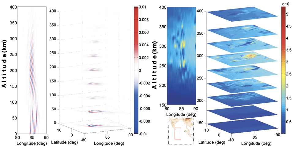 Figure 5. Internal gravity waves (IGWs) generated by the Sumatra tsunami and the response of the ionosphere to neutral motion at 02:40 UT (almost two hours after the earthquake). On the left, the normalized vertical velocity induced by tsunami-generated IGWs in the neutral atmosphere is shown. On the right, the perturbation induced by IGWs in the ionospheric plasma (in electrons per cubic meter) is shown, with the maximum perturbation at an altitude of about 300 kilometers. The vertical cut shown in these profiles is at a latitude of -1 degree.