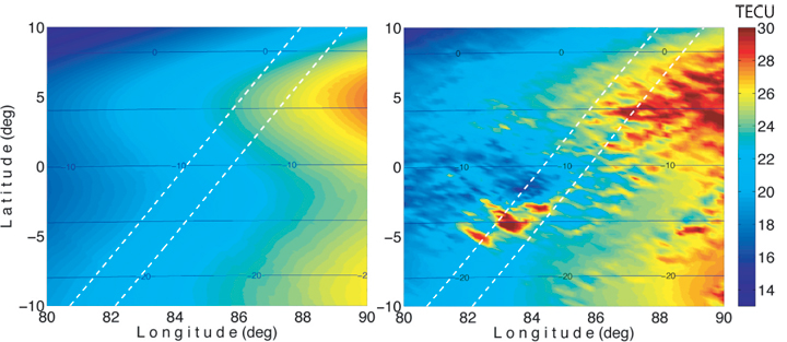 Figure 6. The signature of the Sumatra tsunami in total electron content (TEC) at 03:18 UT (right) compared with the unperturbed TEC (left). The TEC images have been computed by vertical integration of the perturbed and unperturbed electron density fields. The broken lines represent the Topex/Poseidon (left) and Jason-1 (right) trajectories. The blue contours represent the geomagnetic field inclination.