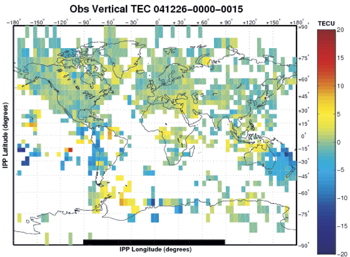 Figure 7. The total electron content (TEC) between 01:00 and 01:15 UT on December 26, 2004, at ionosphere pierce points (IPPs) provided by a global network of more than 1,000 GPS tracking stations. To highlight variations, a five-day average of TEC has been subtracted from the observed TEC.