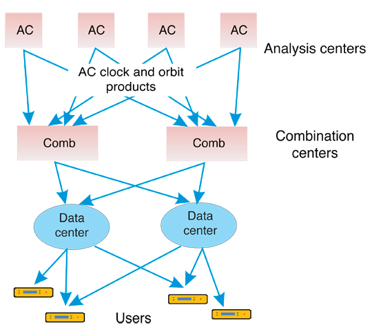 Figure 3 illustrates the analysis-center to combination-center to user-network architecture. As with the classical orbit and clock products, the reliability of real-time products will be assured through the creation of a combined product that is based on submissions from a minimum of three RTACs. Analysis centers are encouraged to adopt the best practice of sending generated product streams to two independent combination centers. To ensure the availability of products, users will have redundant data centers from which to choose real-time products.