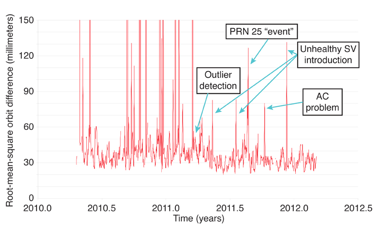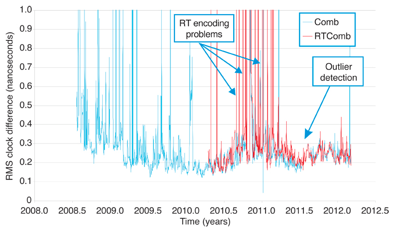 Figure 4 shows the history of the clock RMS performance of the single-epoch combination solution against the IGS “rapids.” This was the first combination product generated by the RTPP, and it started as a batch combination from daily orbit and clock file submissions by the RTACs. From early in 2010, ESOC started providing the first real-time combination product, generated directly by processing the real-time correction streams. The batch combination is in blue, while the real-time combination, starting in 2010, is in red. After an initial improvement phase, the results are stable except for occasional outliers. The outliers are due to problems in the individual solutions, and these should be removed by a properly executed combination methodology. Outliers in the combination towards the end of 2010 and beginning of 2011 were caused by RTCM encoding errors in some RTAC streams. Improvements to the outlier detection algorithm were introduced in early 2011, and it can be seen that the incidence of results with high RMS have been drastically reduced. Most outliers are now caused by poor orbit results after satellite maneuvers. Figure 5 illustrates the effectiveness of the outlier-detection algorithm.