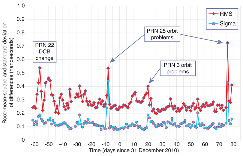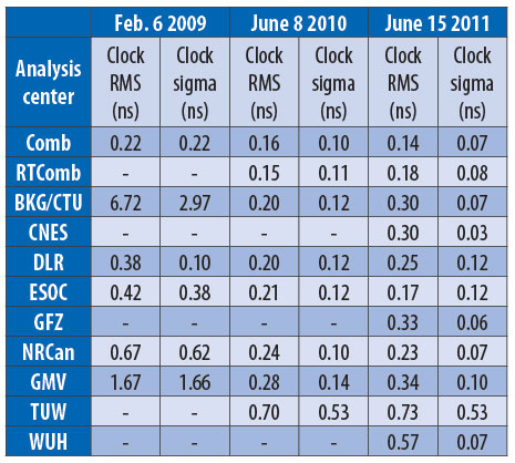 The role of the real-time analysis center coordinator (RTACC), currently performed by ESOC, is to coordinate the activities of the RTACs and to generate and assess the quality of the combined real-time clock product. Table 1 shows snapshots of the performance of RTAC and combined products in the RTPP since 2009. The quality of the individual RTACs and the combined products is assessed through the root-mean-square (RMS) and standard deviation (sigma) of the difference between the individual products and the IGS rapid clock product. It is interesting to note the increase in participation as well as the improvement in the results over time. The target for the pilot project was to produce a combined clock product accurate to within 0.3 nanoseconds when compared to IGS rapid products. This was achieved early on in the project. The June 15, 2011, results shown are consistent with today’s results.