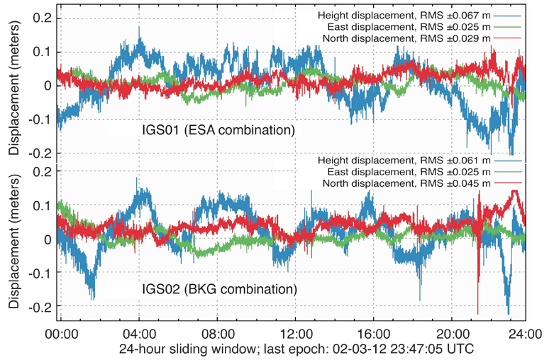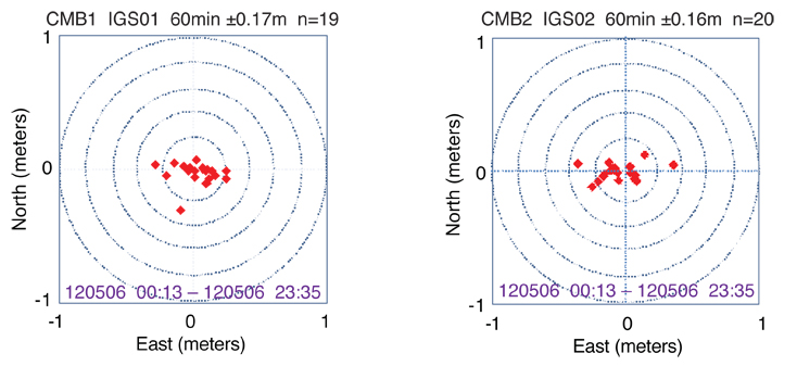 Figure 8 illustrates the results of daily PPP convergence test conducted on the two GPS-only combination products. These are performed at 23 globally distributed sites during successive hours of the day. The results illustrated are the horizontal RMS errors for the last 10 minutes of each test, after an allowed convergence time of 50 minutes.
