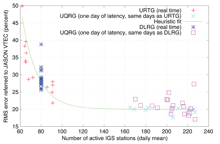 Figure 9 illustrates a comparison between preliminary global RT-VTEC products from UPC and DLR. This plot shows the RMS difference between each center’s product and Jason satellite altimeter VTEC measurements, taken over the ocean, versus the daily average number of active real-time GNSS receivers selected from the global real-time tracking network. A constant number of 80 stations was chosen for the DLR comparisons. As a control for the comparisons, UPC’s rapid product (UQRG) was also used. The Jason comparisons are considered pessimistic for the overall global VTEC product accuracy because the land-based tracking stations are generally located quite far from the location of the Jason measurements. The importance of a reliable globally distributed and sufficiently dense real-time GNSS tracking network is evident. These results suggest that it may be feasible to combine real-time VTEC products from several centers into a robust IGS real-time ionosphere product.