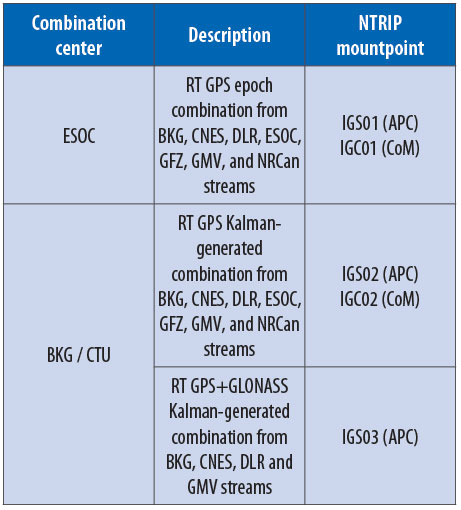 Table 2 shows combined product streams operating within the RTPP. Both a single-epoch combination product developed by ESOC and a Kalman-filter combined product developed collaboratively by BKG and CTU are available. A GPS-plus-GLONASS Kalman-filter combined product has also been developed at BKG and CTU.
