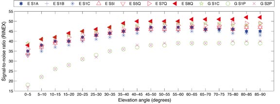To compare the GPS with the GIOVE-A SNR values, we ordered the corresponding SNR values of all stations on all days by satellite position into a grid with widths of 5 degrees in azimuth and 5 degrees in elevation angle. For the evaluation, we took the grid cells occupied by both GPS and GIOVE-A values and computed the median over all the cells of equal elevation angle. The median per elevation-angle bin for each signal is shown in FIGURE 1.