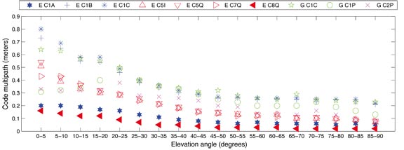In order to compare the code multipath level of GPS versus GIOVE-A, we sorted the multipath values using a grid covering the sky with widths of 5 degrees for both elevation angle and azimuth as before. FIGURE 2 shows the median standard deviation of the code multipath values, derived in each grid cell per day and station, versus the elevation angle. No significant difference between GPS C1C and GIOVE-A C1B and C1C, the open code signals on G1/E1, could be found. The code multipath behavior of the GPS precise codes are comparable with the GIOVE-A C5I, C5Q, and C7Q, whereas the C8Q shows the least code multipath effects closely followed by the GIOVE-A C1A, the public regulated service signal.