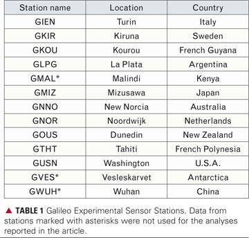 Microwave Analysis. For the GIOVE-A signal analysis and precise orbit determination we used the RINEX data from all of the GESS stations available from the GIOVE archiving facility (see TABLE 1). All stations are equipped with GPS/Galileo antennas, built by Space Engineering S.p.A. and Galileo Experimental Test Receivers (GETRs), built by Septentrio. The data, containing tracking data of all GPS satellites and the GIOVE-A satellite, is given in the RINEX 3.00 data format with a sampling interval of 1 second. To save on storage space for the long-term analyses, such as orbit determination, the RINEX data is decimated to 30-second samples and Hatanaka-compressed, using a test version of the Hatanaka software for the RINEX 3.00 format.