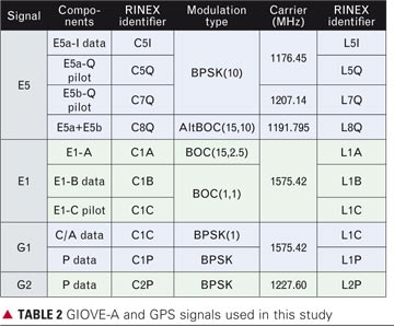 The signal analyses shown here were carried out using GNU Octave, an open-source program for performing numerical computations similar to Matlab, and different scripts developed by the Institut für Physikalische Geodäsie at the Technische Universität Darmstadt. These analyses cover a selection of the designated Galileo signals recorded by the GESS within the time span from December 16 to 27, 2006. Within this time period, the current GPS signals, as well as the GIOVE-A signals E1 and E5, shown in TABLE 2, were recorded. The table also shows the signal components as well as the RINEX observation-type identifiers, which we use in this article.