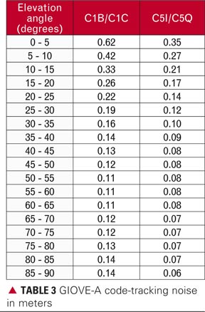 Code-Tracking Noise. For signals containing data and pilot components, as in the case of those from GIOVE-A, the code-tracking noise can easily be computed as the difference between the data and the pilot signal. The advantage of this computation scheme is that both signals are influenced by identical error sources (atmospheric errors, multipath errors, receiver errors, etc.). Based on the assumption of equal uncertainties in the two components, we divided the resulting noise values by the square root of two to specify the noise level of each part according to the laws of error propagation. TABLE 3 shows the code-tracking noise for the two analyzed GIOVE-A codes sorted by elevation angle. The median code-tracking noise is 0.62 meters for C1B/C1C and 0.35 meters for C5I/C5Q, for observations below an elevation angle of 5 degrees. For the C1B and C1C code measurements, the noise median stays below 0.2 meters for an elevation angle above 25 degrees, whereas the median for the C5I and C5Q code measurements for elevation angles above 35 degrees even comes down below 0.1 meters. The results discussed above are consistent with the code-tracking noise values published previously.