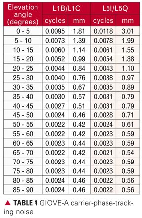 Carrier-Phase-Tracking Noise Analyses. In the same manner as that carried out with the code, we computed the GIOVE-A carrier-phase-tracking noise as the difference of the two components (pilot minus data). To accommodate the effect of error propagation, the resulting errors were divided by the square root of two. The resulting phase-tracking noise values were sorted by elevation angle and can be found in TABLE 4.