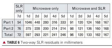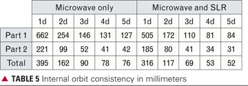 As can be seen from TABLE 6, the 3-day solution based on the microwave-only data has the lowest SLR residuals and indicates a radial precision of around 100 millimeters. A similar behavior can be seen in the microwave plus SLR solution with the exception of the 1-day solution (and to a smaller extent also the 2-day solution) where the orbit solution is mainly driven by the SLR data, but the quality as can be seen from the internal consistency of the orbit is poor. Interestingly, there is a large improvement in SLR residuals for the microwave plus SLR solution, although the number of SLR data points is only 2 percent of the total tracking data in the combined solution. The values for the SLR-only solution are included in the table to give an indication of the lowest possible SLR residuals one could expect by combining the microwave and SLR data.