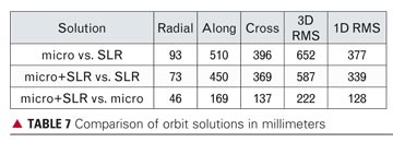 Orbit Comparison. To get an indication of the overall orbit quality, the best solutions were compared against each other for the second period of observation. TABLE 7 gives the RMS differences between the SLR only (SLR), 3-day microwave only (micro), and the 3-day microwave and SLR solution (micro+SLR) for the radial, along-track, and cross-track position components as well as the norm (3D).