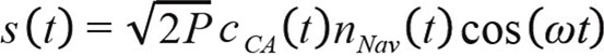 where P is the signal power, cCA(t) is the C/A-code modulation stream of plus and minus ones, nNav(t) is the navigation bitstream that is modulated onto the signal, and the cos(ωt) factor represents the fundamental carrier frequency, with ω being the angular frequency (ω=2πf). For the GPS L1 signal, f = 1575.42 MHz. The GPS receiver processes this signal (in the presence of noise) into the observables (such as range, phase, or Doppler frequency shift), or the positions and velocities that we need.