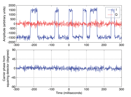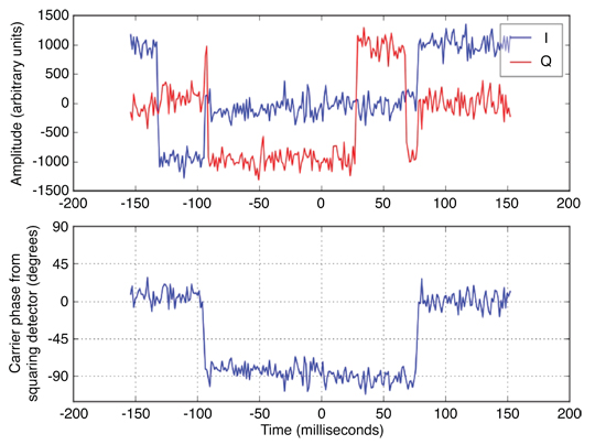 However, not all of our measurements are quite this typical. In some cases we observe what we term “carrier-phase signal events” (CPSEs). FIGURE 3 shows a typical example of such a CPSE taken on SVN48 (PRN21) on March 13, 2010. In the upper plot, note the sudden change in amplitude in the quadrature component near -100 milliseconds. In the lower plot, note the sudden changes in the carrier phase that occur at the same times as the amplitude changes. In this case, the squaring detector shows clear evidence of a transition that was not anticipated, and appears to be of approximately 90° and persist for approximately 175 milliseconds.