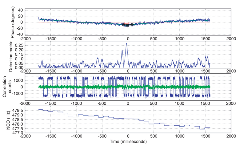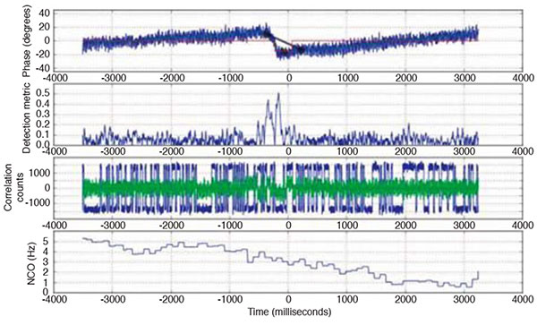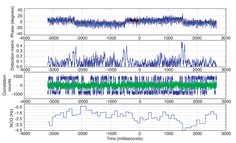 Since the GCAF provides access to the high-rate complex correlation values, we can “decode” the navigation modulation sequence, nNav(t), from the incident signal by tracking the correlation peak phase and watching for phase changes. These phase changes correspond to distinct changes in the carrier phase. FIGURE 2 shows results from measurements collected with the GCAF while observing space vehicle number (SVN) 26 / pseudorandom noise code number (PRN) 26 on August 22, 2009. The top plot shows the amplitude of the in-phase component of the incident signal in blue, and that of the quadrature component in red. The amplitude is in arbitrary units, while the time along the bottom is in milliseconds–so the entire snapshot is only 0.6 seconds long.