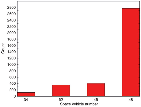 Over the entire GPS constellation, we see events with rapid phase changes most frequently associated with the signals from three SVNs: 45 (an original Block IIR satellite), 48 (a Block IIR-M satellite), and 62 (a Block IIF satellite). This is most clearly shown in FIGURE 7, which contains a histogram of the number of events with rapid phase changes we have seen, broken out by SVN. For this histogram, we have chosen to count only those events that have well-defined phase discontinuities. Other SVNs, for example SVN34 (a Block IIA satellite), will show CPSEs on occasion, but the signals from this set of three SVNs are the ones that we have come to observe most closely. Until recently, SVN62 was the newest SV, and so we have been heavily weighting our observations on this SV.