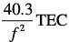 where TEC is the total electron content in so-called TEC units or TECUs (1016 electrons per square meter) and f is the signal carrier frequency in MHz. The scaling factor is a function of the electron’s charge and mass and a constant of electromagnetism theory called the permittivity of free space also known as the electric constant. The scaling factor is actually 40.308193 but this much precision is not generally needed in GPS calculations.hile the code signals are delayed, making pseudoranges longer than they would be in the absence of the ionosphere, the phases of the signal carriers are advanced, make carrier-phase measurements shorter — but by exactly the same magnitude as the code delays.