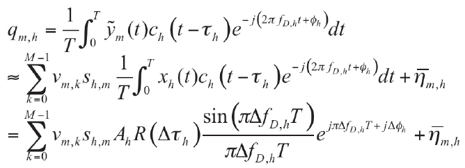 where vm,k are the coefficients of the calibration matrix, C and R(Δτh) is the multi-peaked ACF. τh, fD,h and φh are the code delay, Doppler frequency and carrier phase estimated by the receiver and Δτh, ΔfD,h and Δφh are the residual delay, frequency, and phase errors.