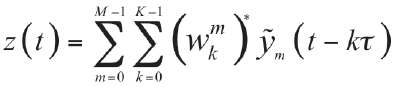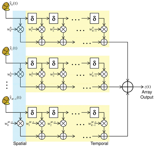 A simplified representation of a typical space-time processing structure is provided in Figure 1. Each antenna element is followed by K taps with δ denoting the time delay between successive taps forming the temporal filter. The combination of several antennas forms the spatial filter. wmk are the space-time weights with 0 ≤ k ≤ K and 0 ≤ m ≤ M. k is the temporal index and m is the antenna index.