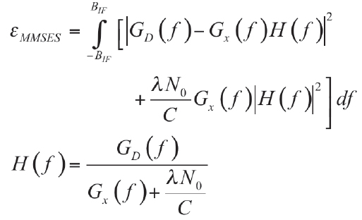 where H(f) is the transfer function of the temporal filter that minimizes the MSE, εMMSES, between the desired spectrum, GD(f), and filtered spectrum, Gx(f)H(f). The spectrum of the incoming BOC signal is denoted by Gx(f). λ is a weighting factor determining the impact of noise with respect to that of an ambiguous correlation function. N0 is the noise power spectral density and C the carrier power. The desired spectrum is considered to be a BPSK spectrum. Since this type of processing minimizes the MSE, it is denoted MMSE Shaping (MMSES).
