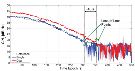 BOCs(1,1) signals collected using Figure 9 were tracked using the temporal and spatial processing technique described in the opening figure. The C/N0 results obtained using single and two antennas are provided in Figure 10. In the single antenna case, only temporal processing was used. In this case, the loop was able to track signals for an approximate C/N0 of 19 dB-Hz. Using the space-time processing, the dual antenna system was able to track for nearly 40 seconds longer than the single antenna case, thus providing around 2 dB improvement in tracking sensitivity.