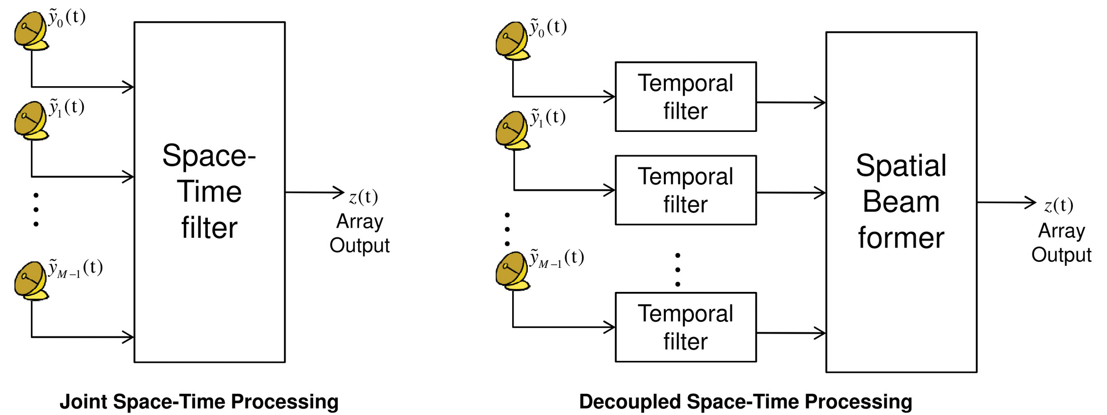 Space-time processing algorithms can be broadly classified into two categories: decoupled and joint space-time processing. The joint space-time approach exploits both spatial and temporal characteristics of the incoming signal in a single space-time filter while the decoupled approach involves several temporal equalizers and a spatial beamformer that are realized in two separate stages (Figure 2).