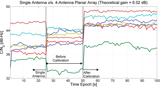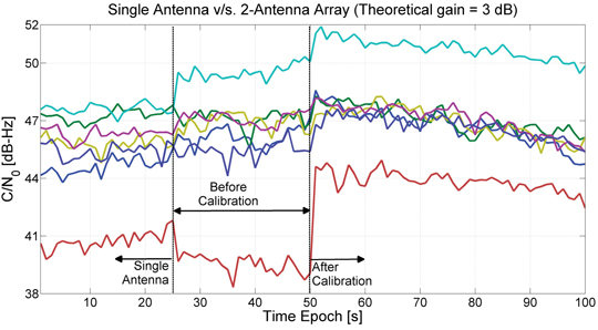 - After Calibration that provides C/N0 estimates obtained by compensating the effects of both steering vector, si and calibration matrix, C, before combining correlator outputs from all antennas.