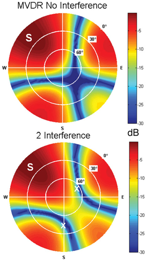 In the bottom part, results in the presence of interference are shown. Two interference signals were introduced at 60 and 45 degree elevation angles. It can be clearly observed that, in the presence of interference, the MVDR beamformer successfully adapted the array beam pattern to place nulls in the interference DoA.