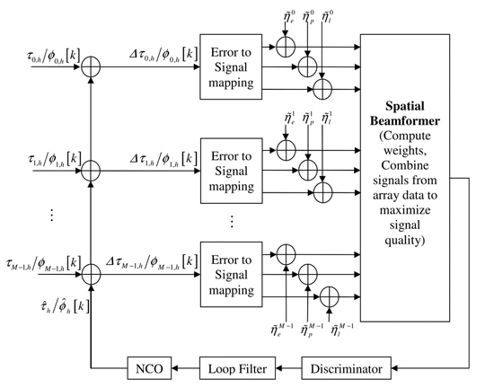 . The combined signal and noise components from all antenna elements are fed to the spatial beamformer to produce a single output according to the algorithm described in the Methodology section. Finally, the beamformer output is passed through the loop discriminator, filter and NCO to provide a new estimate . The Error to Signal mapping block and the noise generation process accounts for the impact of temporal filtering.