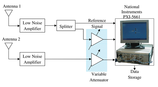 Real data analysis. Figure 9 shows the experimental setup considered for analysis of the proposed combined space-time algorithm. Two antennas spaced 8.48 centimeters apart were used to form a 2-element linear antenna array structure. The NI front-end was employed for the data collection process to synchronously collect data from the two-antenna system.