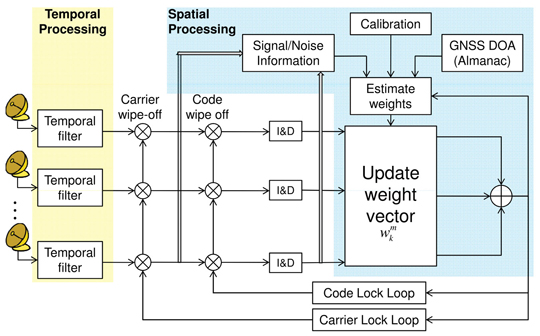 where (wmk)* denotes complex conjugate. The spatial-only filter can be realized by setting K=1 and a temporal only filter is obtained when M=1. The weights are updated depending on the signal/channel characteristics subject to user-defined constraints using different adaptive techniques. This kind of processing is often referred to as Space-Time Adaptive Processing (STAP). The success of STAP techniques has been well demonstrated in radar, airborne and mobile communication systems. This has led to the application of STAP techniques in the field of GNSS signal processing. Several STAP techniques have been developed for improving the performance of GNSS signal processing. These techniques exploit the advantages of STAP to minimize the effect of multipath and interference along with improving the overall signal quality.
