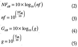 Note that both noise factor (nf) and gain (g) are shown in lowercase to distinguish them as linear measures rather than logarithmic measures. The conversion from linear to logarithmic gain and noise figure (and vice v