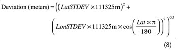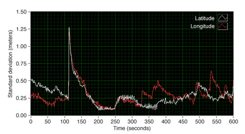 One simple method to evaluate the horizontal repeatability of the receiver position versus time is to calculate the standard deviation on a per-sample basis of each recorded latitude and longitude (in degrees). Once the standard deviation is measured in degrees, we can roughly convert this to meters with the following equation: