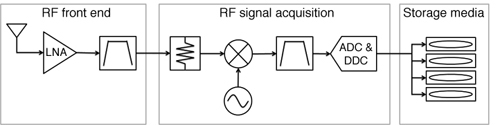 Recording GPS or GLONASS signals off the air can be done in a fairly straightforward manner. An RF recording system combines appropriate antennas, amplifiers, and an RF signal recorder (usually a VSA) to capture many hours of continuous RF signal. In such a system, the basic components include the RF front end, the RF signal-acquisition device, and high-volume storage media. A block diagram of a typical recording system is shown in Figure 1.
