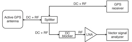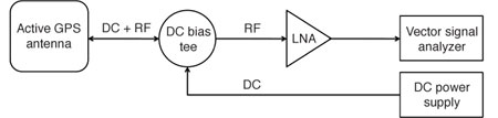 As Figure 4 illustrates, the DC bias from the GPS receiver is used to power the LNA. This method is particularly useful for drive tests because one can observe the receiver’s characteristics, such as velocity and dilution of precision, while recording.