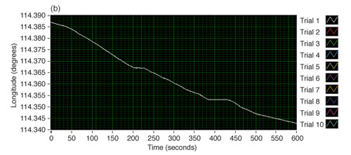 In our case, we used a VSG directly connected to a GPS evaluation board. In the experiments described below, the receiver’s latitude, longitude, and velocity were tracked over time. Data was read from the receiver using a serial port, which read NMEA 0183 sentences at a rate of one per second. NMEA 0183 is a standard protocol developed by the National Marine Electronics Association for communications between marine electronic devices. NMEA 0183 has been adopted by virtually all GPS receiver manufacturers. In our LabVIEW graphical development environment, one can parse all sentences to return satellite and position-fix information.
