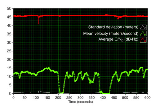 As one can observe in Figure 8, the peak horizontal error (measured by standard deviation) occurring at time = 120 seconds is directly correlated with satellite C/N0 and not correlated with receiver velocity. At this sample, the standard deviation is nearly 2 meters while it is less than 1 meter during most other times. Concurrently, the top four C/N0 averages drop from nearly 45 dB-Hz to 41 dB-Hz.
