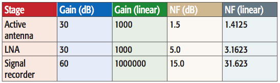 An active GPS antenna using a built-in LNA typically provides 30 dB of gain while introducing a noise figure that is typically on the order of 1.5 dB. The second part of the recording instrumentation provides 30 dB of additional gain as well. Though its noise figure is higher (5 dB), the second amplifier actually introduces very little noise into the system. As an academic exercise, one can use the Friis formula to calculate the noise factor for the entire RF front end of the recording instrumentation. Gain and noise figure values are shown in Table 1.