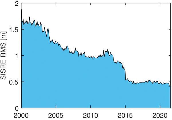 In terms of positioning, the simple statistical benefits of tracking a large number of satellites are probably outweighed by technological advances in GNSS satellites and ground systems, as well as substantial progress in receiver technology. For GPS, the signal-in-space range error (SISRE) that describes the contribution of broadcast orbit and clock errors to the position accuracy has decreased by more than a factor of three (Figure 1).