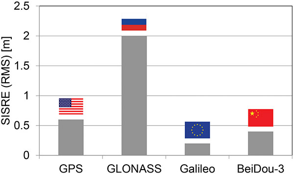 For GPS, but also Galileo and BeiDou-3, the use of highly stable atomic frequency standards has contributed to a notable reduction of the error budget of broadcast ephemerides. The same applies for fast upload capabilities, as in Galileo, or the use of intersatellite links in BeiDou-3. With SISRE values of 0.1–0.2 m and 0.3–0.4 m, these constellations enable even more accurate positioning today than GPS and GLONASS (Figure 2).