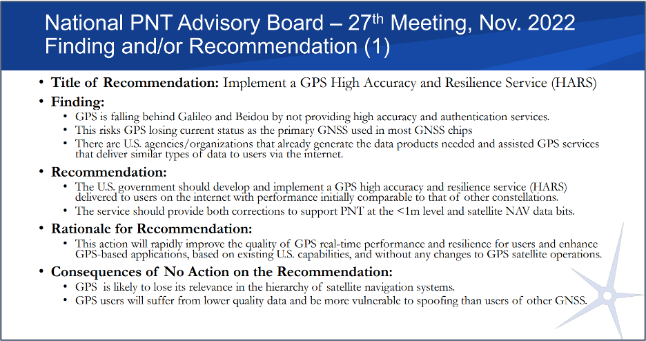 As a result, the path forward for adopting the recommendation for a GPS high accuracy and resilience service is, at best, unclear.