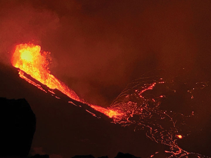 Then on Sunday, Dec. 20, a magnitude 4.4 earthquake struck on Kilauea’s south flank and three fissure vents broke open inside the caldera. Fountaining lava at these vents is estimated to be up to 82 feet high. The vents are feeding lava flows into the base of Halema‘uma‘u crater, which is being filled with lava. The lava lake has been rising several yards an hour since the eruption began at 9:36 p.m. Sunday. The eruption is currently confined to the crater.