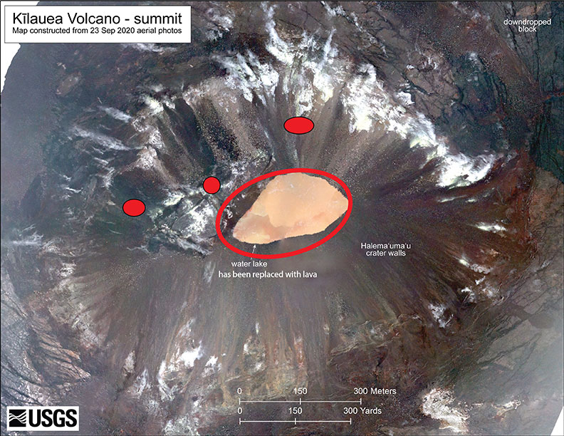 As of Dec. 29, the summit eruption continued with the western vent active (the other vents have been covered by the lava lake). At 3:45 a.m. HST, field crews measured the lava lake as 179 meters (587 feet) deep, about 650 feet below the rim.