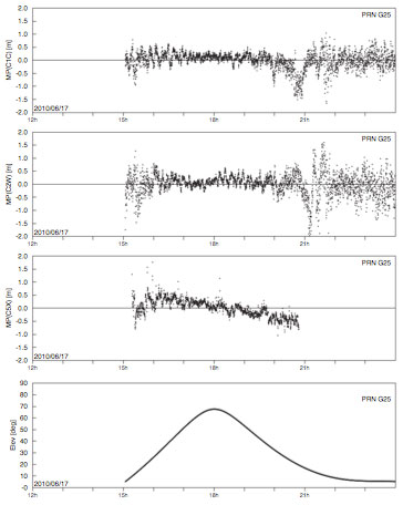 While the new Block IIF satellite has not yet been set healthy and made available for public use, the early measurements collected on June 17 already demonstrate good tracking quality. This is illustrated in Fig. 2, showing the so-called multipath combination for pseudorange measurements from L1 and L2 legacy signals (the upper two panels) as well as the new L5 signal for Singapore, which had continuous visibility of PRN25 during the period of interest. Except for low elevation angles that are affected by strong multipath from structures in the vicinity of the antenna, root-mean-square tracking errors well below 30 centimeters were obtained for all signals.