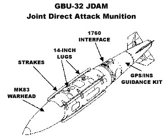 JDAM is a tail kit that turns an unguided dumb munition into an accurate smart bomb. With a range of about 15 nautical miles, the autonomous JDAM can be released from almost every aircraft in the Air Force and Navy inventory from a low or high altitude in almost any type of weather. Once in the air, the weapon uses GPS and inertial navigation to find its target.