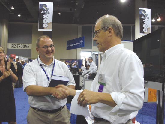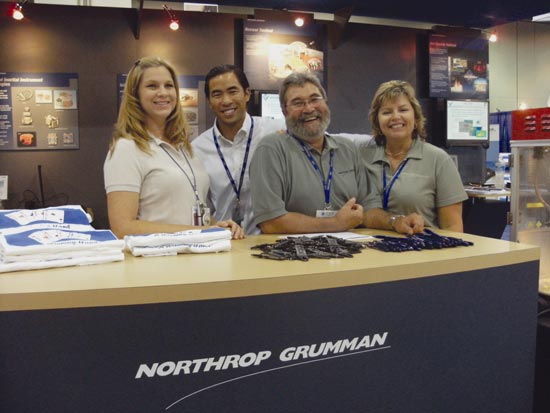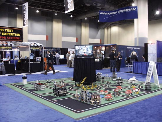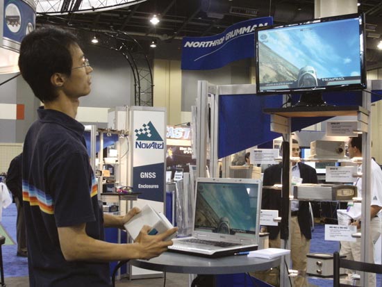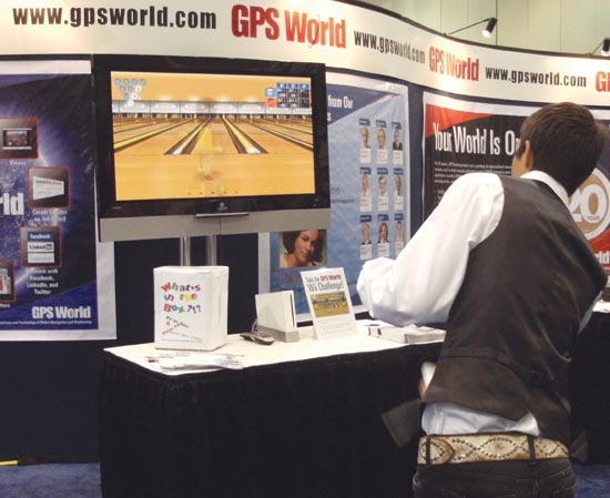 Miniature autonomous vehicles navigating the mean streets of a LEGO town take center stage on the show floor to highlight the Institute of Navigation’s first Mini-Urban Challenge and upcoming second challenge, now seeking sponsors.Northrop Grumman personnel Jill Rigler, Ed Chou, George Vannick, and Velvet Hoover explain the company’s programs to booth visitors on the show floor. Northrop Grumman was a Gold Sponsor of GPS World’s Leadership Dinner.Larry Skorski of the U.S. Coast Guard took first place in GPS World’s Wii Bowling Challenge (score, 225). Editor Alan Cameron presents him with a copy of Brad Parkinson and James Spilker’s book, The Global Positioning System, signed by the first author.