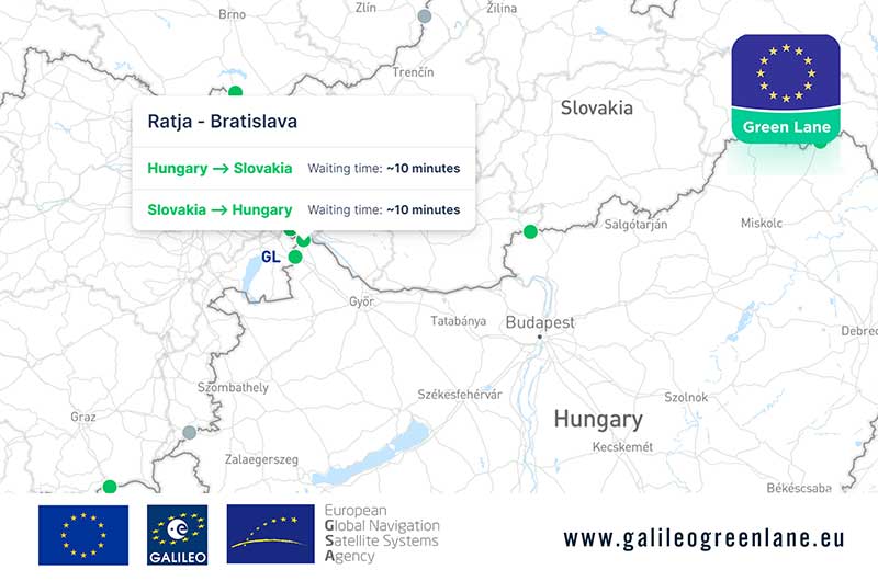 The Galileo Green Lane app being used for the border of Ratja, Hungary, and Bratislava, Slovakia. (Screenshot: ©European GNSS Agency)
